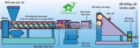 – Hỗn hợp nguyên liệu sau khi trộn được đưa vào máy đùn. Nguyên liệu sẽ được đốt nóng chảy thông qua hệ thống nhiệt và được trục vít đẩy nguyên liệu qua phần khuôn nóng để hoàn thành quá trình nhựa hóa. Sau đó được kéo qua hệ thống khuôn ép lạnh để định hình tấm, tạo độ dày mỏng cho tấm nhưng chưa có kích thước chuẩn và là một dải dài